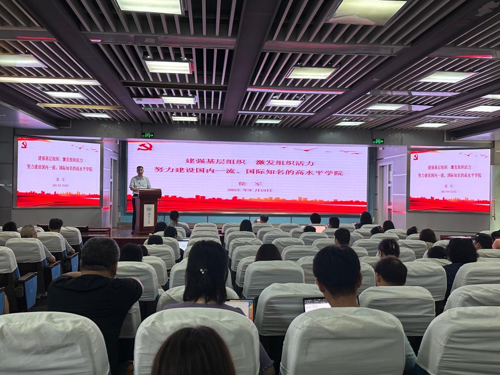 院党委书记徐军为全体教职工上“强化基层组织,激发组织活力,努力建设国内一流、国际知名的高水平学院”主题党课。徐军书记围绕“为什么要开展组织建设年活动”、“外国语学院怎么开展”两个问题详细阐述,开展组织建设是推进教育治理体系和治理能力现代化的重要内容,是应对形势变化、竞争加剧的重要举措,是解决当前学??凸鄞嬖诘奈侍獾男枰=岷瞎ぷ魇导?,徐书记提出外国语学院应该如何加强组织建设,一要精心谋划设计新阶段学院发展目标,要把明确目标、达成愿景作为当前组织建设的首要任务。二要更高标准加强教学科研队伍建设,要坚持以人为本,全面构建一支与一流学院相适应的教学科研及管理队伍。三要健全机制激发各类组织自身活力,要加大教学科研评价机制改革力度,调动全院教师的积极性、团结一切可以团结的力量,集中优势申报大项目、产出大成果。