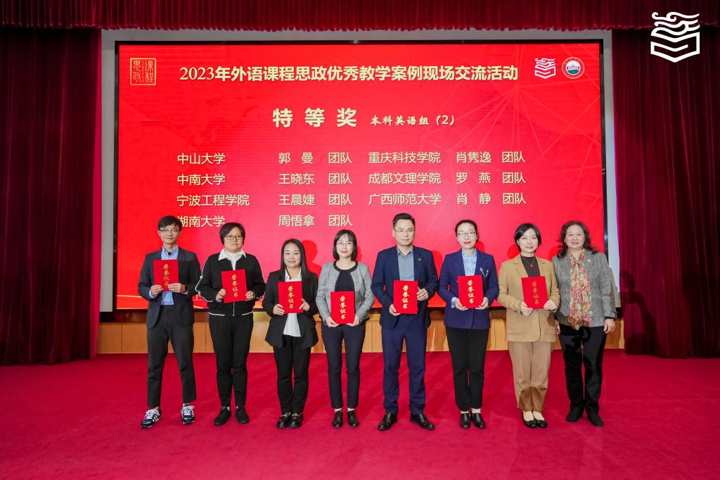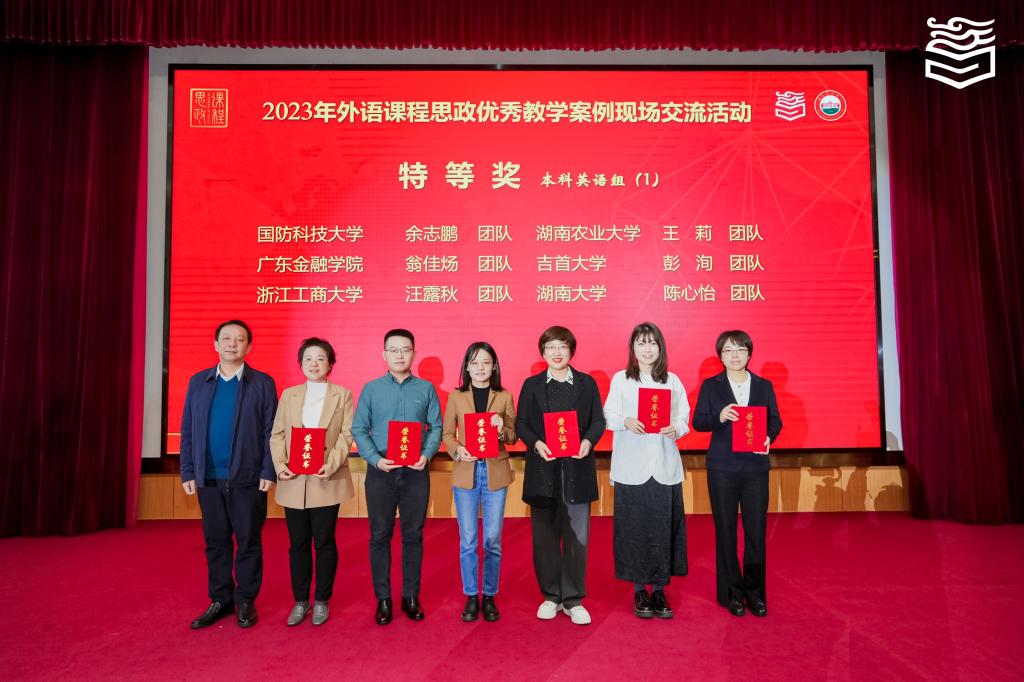 11月11日,2023年全国高等学校(本科)外语课程思政优秀教学案例现场交流活动在湖南农业大学举行。外国语学院周悟拿老师团队(胡凌、陈千谦、谭鹂雯)作品荣获英语专业组特等奖,陈心怡老师团队(稂建中、蔡琰彬、欧志峰)作品荣获大学英语组特等奖。