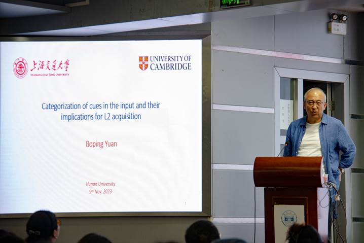11月9日下午,“大樟讲坛”第20期在我院学术报告厅举行。上海交通大学语言学特聘教授、剑桥大学博士生导师、剑桥大学丘吉尔学院院士袁博平教授为我院师生做了题为“Categorization of cues in the input and their implications for L2 acquisition”的学术讲座。讲座由曾涛教授主持,吸引了学院百余师生参加本次讲座。