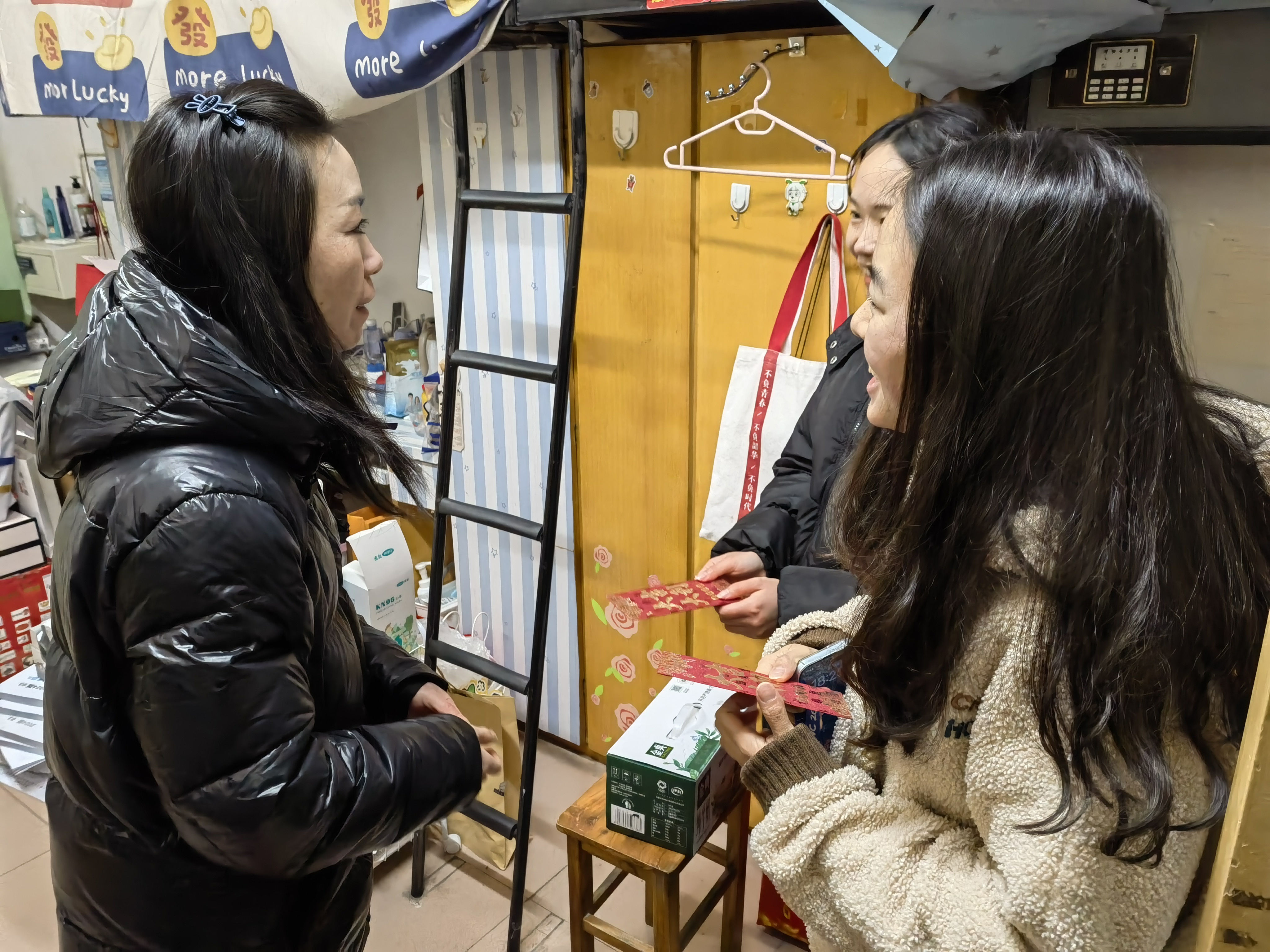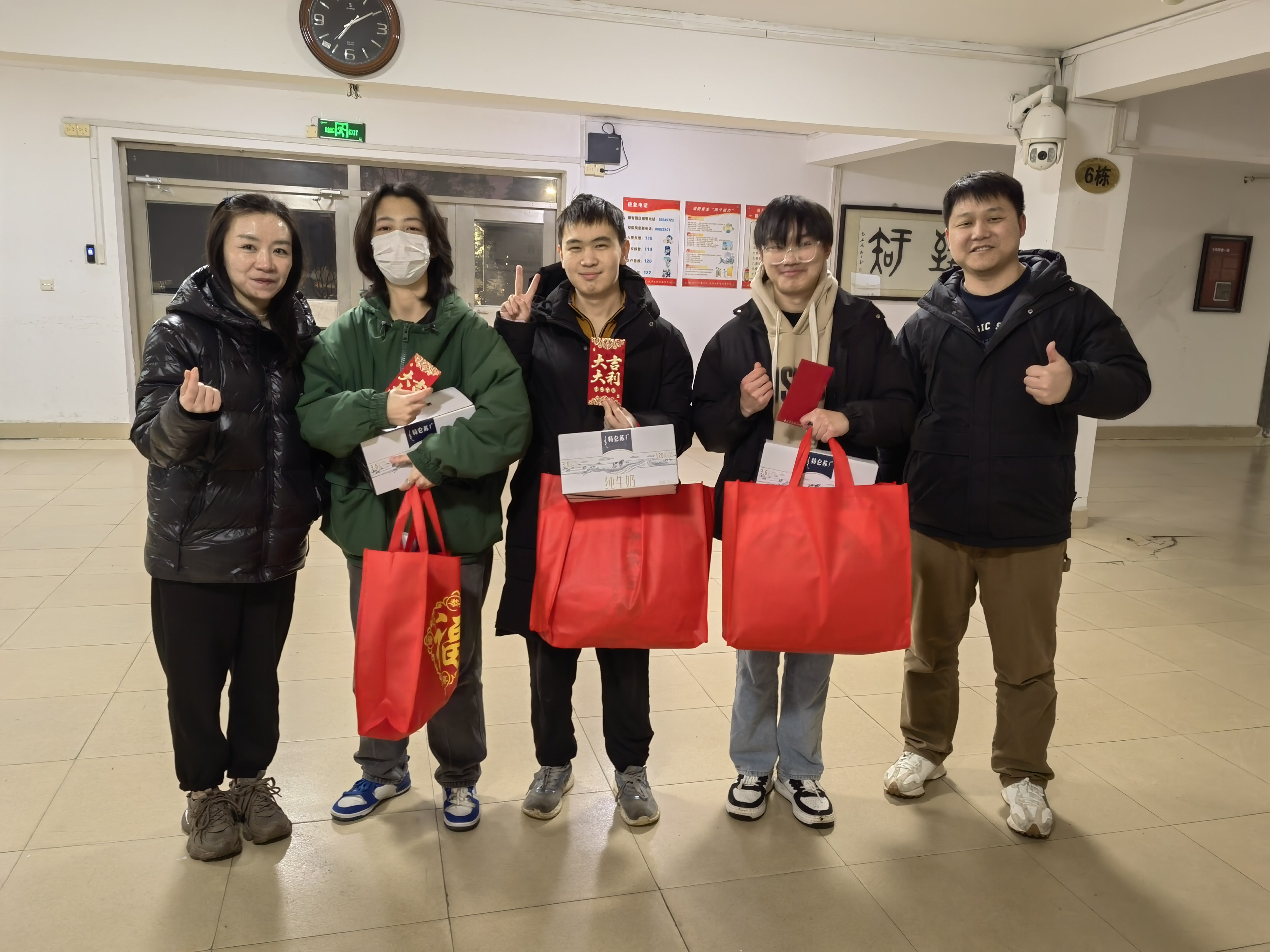 在学生宿舍,老师们与留校学子亲切交流,详细了解他们留校期间的学习生活安排,勉励大家合理安排学习生活,规范作息,留校期间注意宿舍用电安全,有困难及时向学院反映。走访期间,老师们为留校学子送上了春节大礼包,并送上节日的祝福,祝愿留校同学们度过一个平安、祥和、温暖的春节。