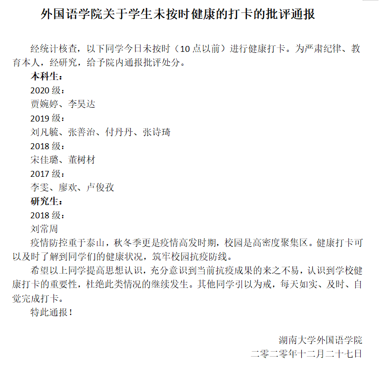 上一条:外国语学院关于本科生未按时健康打卡的批评通报 下一条:外国语学院关于本科生未按时健康打卡的批评通报