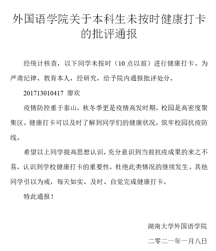 上一条:外国语学院关于本科生未按时健康打卡的批评通报 下一条:外国语学院关于学生未按时健康的打卡的批评通报