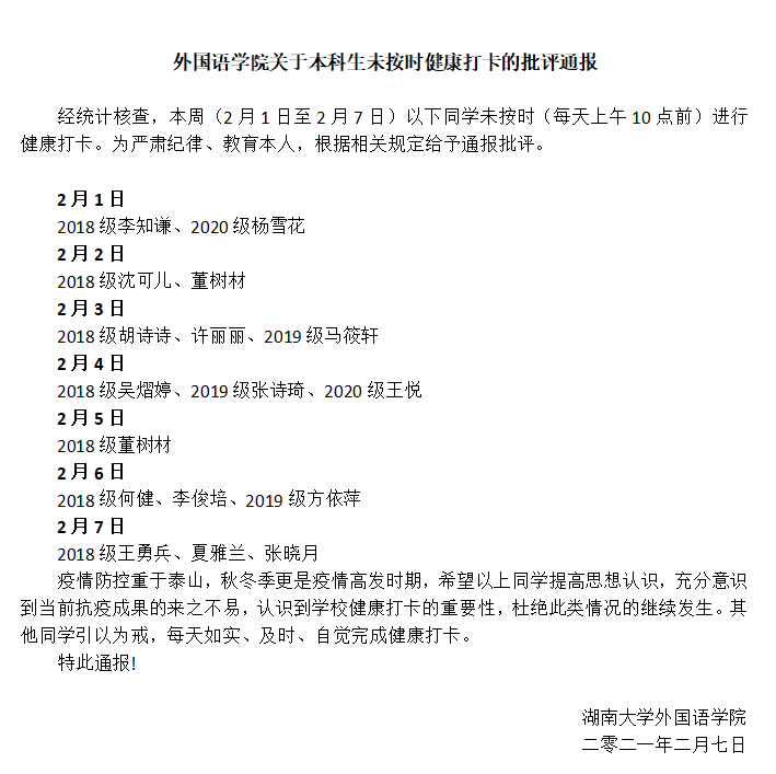 上一条:外国语学院关于寒假私自留校学生的通报批评 下一条:湖南大学曾涛团队招聘全职博士后研究人员