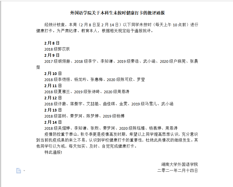 上一条:外国语学院关于推荐评选湖南省普通高校、湖南大学2021届优秀本科毕业生和创新创业优秀本科毕业生的名单公示(省优) 下一条:外国语学院关于研究生未按时健康打卡的批评通报