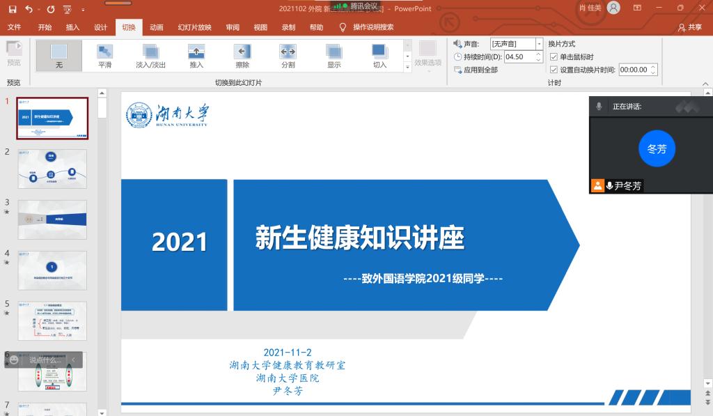 湖南大学外国语学院2021级入学教育系列之“卫生健康与资源利用说明”主题讲座于11月2日在腾讯会议成功举办。本次讲座以“图书馆资源利用说明和平台使用”及“校医院疫情防控和传染病防控知识普及”为主题,由湖南大学图书馆晁蓉老师及湖南大学校医院尹冬芳老师主讲。外国语学院全体2021本科及研究生新生参与了此次讲座。