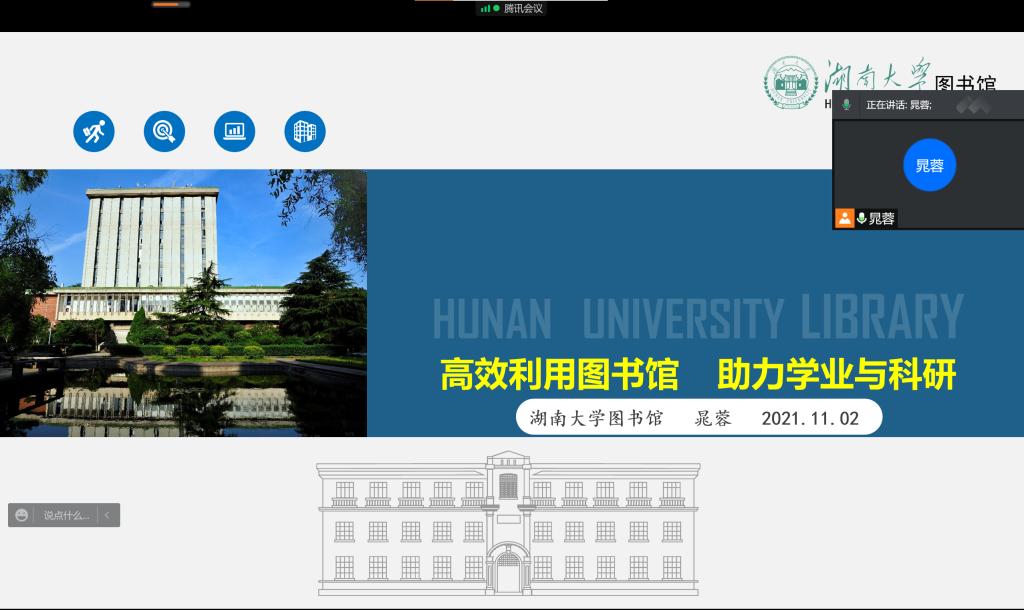 讲座伊始,晁蓉老师为大家介绍了我校校园VPN以及图书馆入馆、借阅、座位预约等基本操作流程。随后,晁老师重点阐述了湖南大学、湖南师范大学、中南大学三校书籍文献互借共享政策以及线上新书闪借操作流程等。通过老师的讲解,同学们对图书馆资源、实验平台利用等都有了更为清晰的了解和认识。