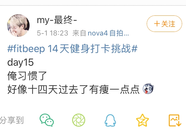 我院特举办的5.25心理节系列活动之“Fit Beep”线上健身打卡活动“‘Fit Beep’线上健身打卡活动”不仅为同学们保持好身材提供了动力从中还鼓励同学们积极关注个人健康状况,提升自身身体素质,养成良好的锻炼习惯,以更良好的精神面貌重返校园。