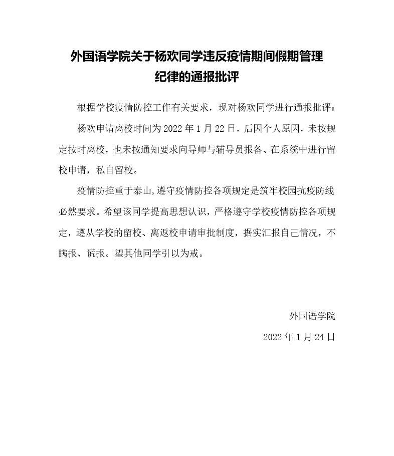上一条:外国语学院2022届校级优秀本科毕业生和创新创业优秀本科毕业生评选拟推荐名单公示 下一条:外国语学院关于陈静茹同学违反疫情期间离校管理规定的通报批评